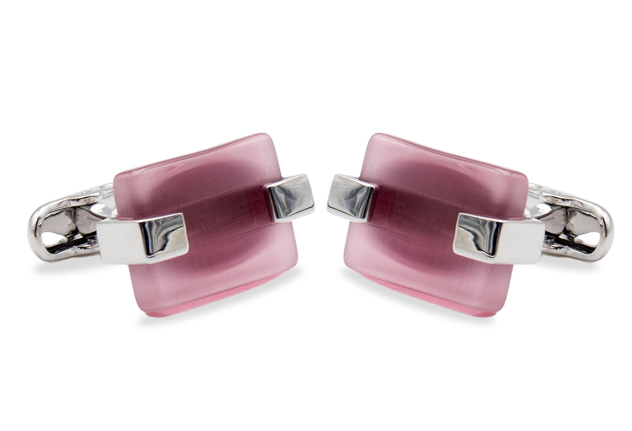 Horizontal pink acrylic running on the top and bottom of a chrome piece elevates the elegance of refined cufflink.