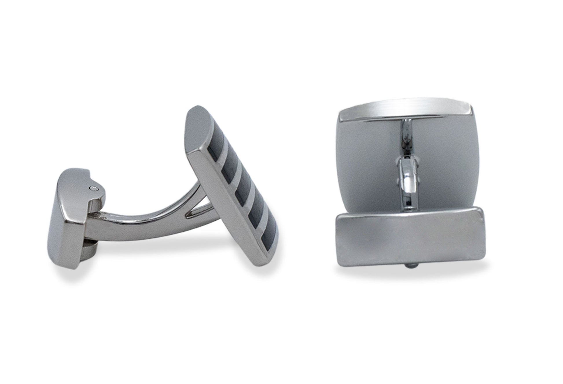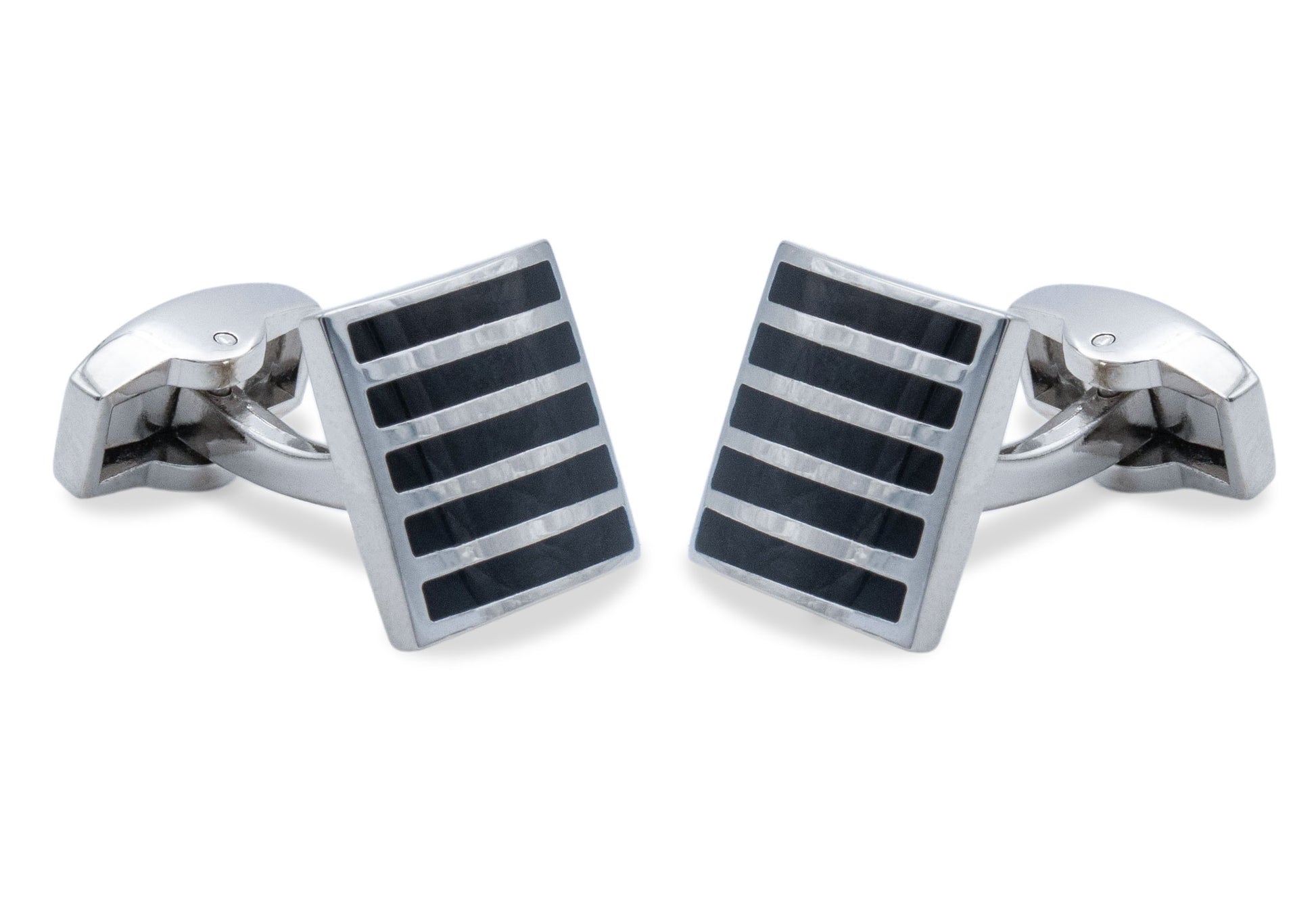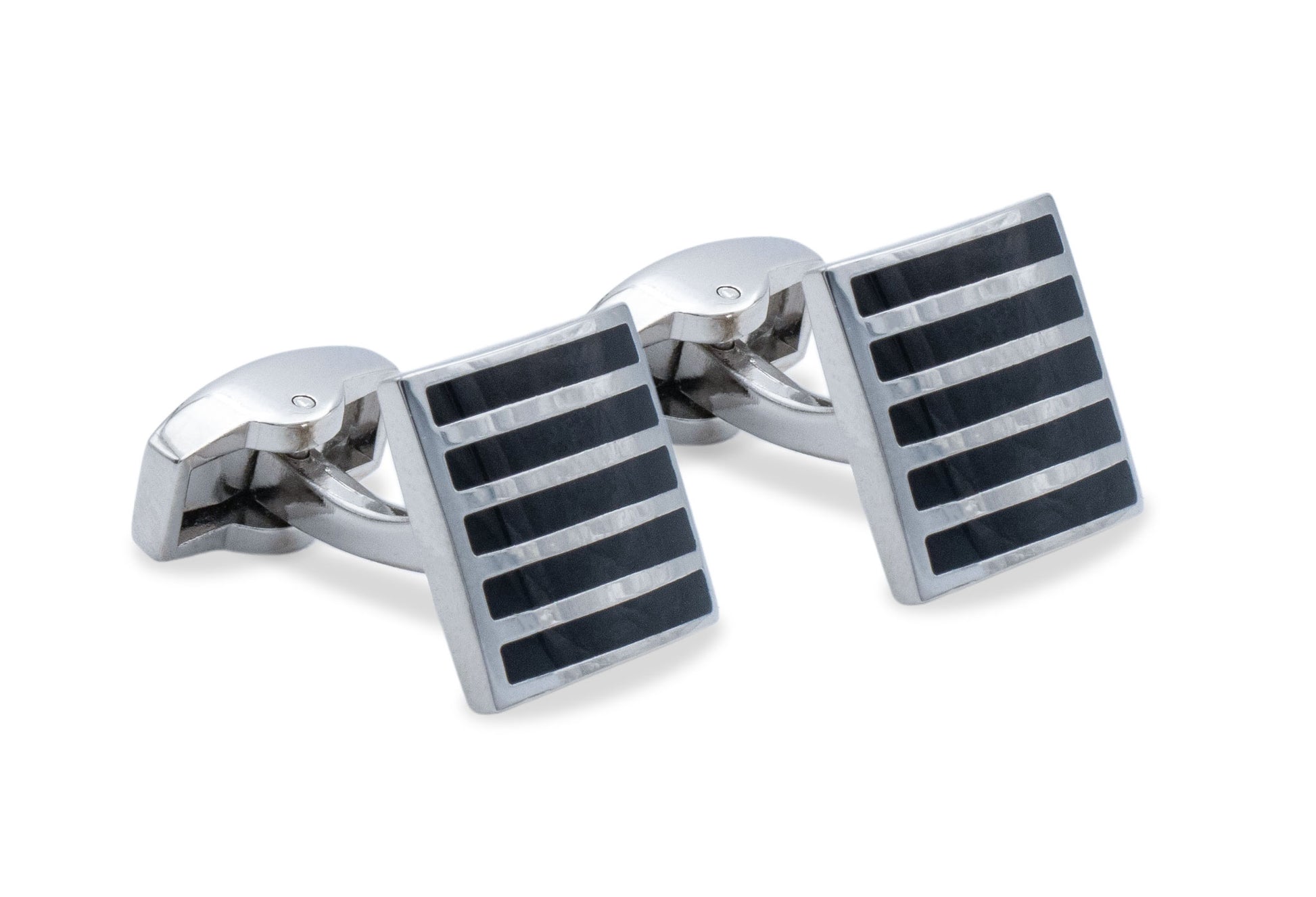 Featuring a square frame inlaid with chrome horizontal stripes to pair with your best looking french cuff shirts.