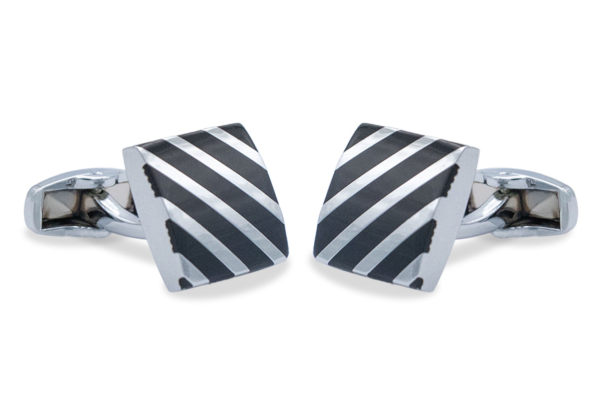 Featuring a square frame inlaid with black diagonal stripes to pair with your best looking french cuff shirts.