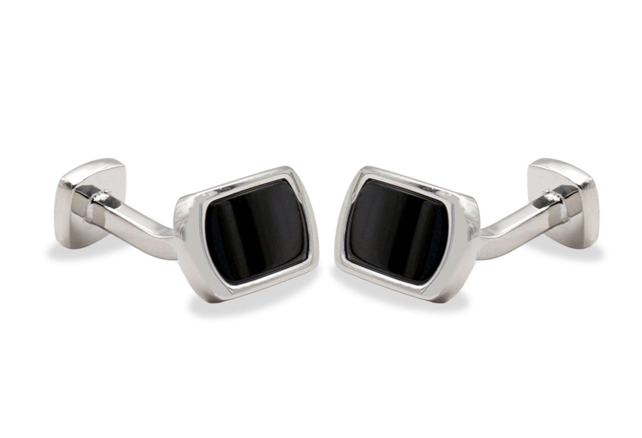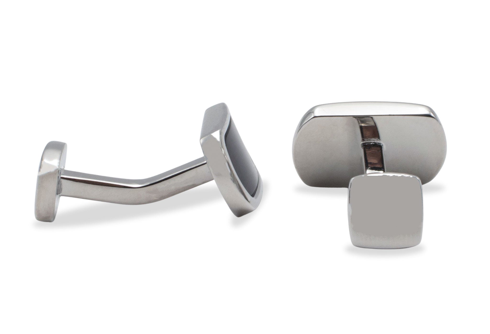 Horizontal deep black running across a chrome piece. Elevate the elegance of your french cuff shirt with this cufflink.