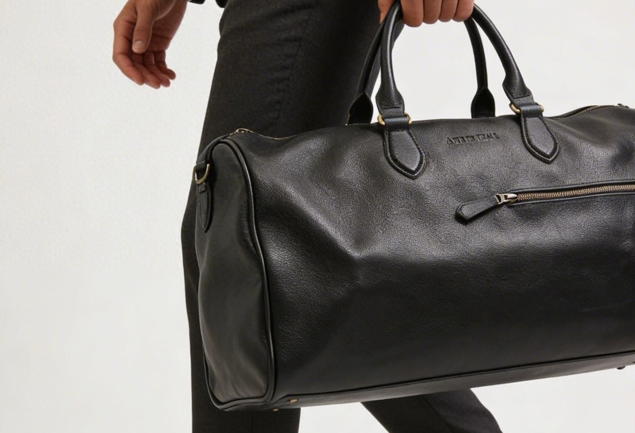 The Bolivar Black Leather Duffle is crafted from full grain leather that develops a natural patina over time. This spacious bag features sturdy handles and a structured silhouette, making it ideal for weekend trips, gym sessions, or everyday travel. Timeless style meets practical durability.